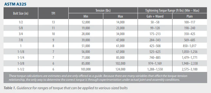 The fastener needs to clamp parts together; and the clamping force must be sufficient to prevent separation of movement between the clamped parts when forces are applied. Selecting the correct fastener diameter to support the required clamp force will provide a secure, high reliability joint. A common problem is the selection of an under-sized fastener and using a higher strength material. The designer will specify a high torque for the fastener. The high torque causes the fastener to stretch by an excessive amount. Similarly, selecting an over-sized fastener does not necessarily lead to a tighter clamped joint. An over-sized fastener will stretch less under tension and result in the possibility of bolt loosening. Table 1 offers guidance on bolt size and ranges of tightening torque for uncoated bolts and galvanized and waxed bolts. Selecting the properly sized fastener and specifying an appropriate torque are challenges. Inexperienced designers should consider consulting with an expert.