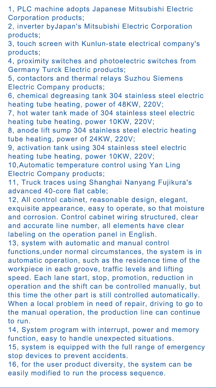 13, system with automatic and manual control functions,under normal circumstances, the system is in automatic operation, such as the residence time of the workpiece in each groove, traffic levels and lifting speed. Each lane start, stop, promotion, reduction in operation and the shift can be controlled manually, but this time the other part is still controlled automatically. When a local problem in need of repair, driving to go to the manual operation, the production line can continue to run.